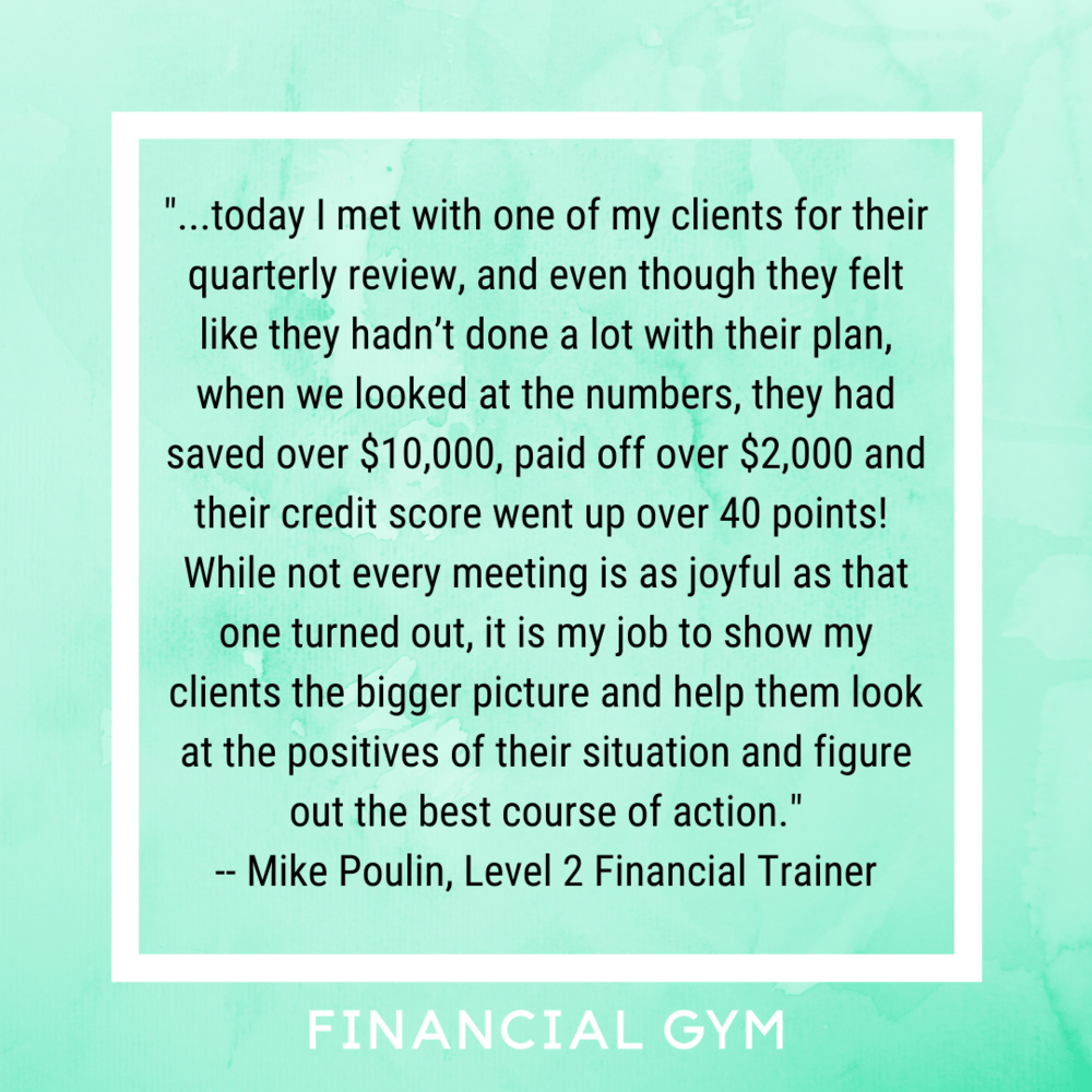 When I meet new people, or I am catching up with friends or family and they ask “What do you do?” and I respond with “I’m a Financial Trainer” it’s usually met with a puzzled look or a follow up question sort of like “Is that like a Financial Advisor or….?” I explain that we aren’t a traditional financial company, we are set up a lot like a traditional gym, where you pay a monthly membership and you get complete access to your Best.Financial.Friend. (me) a lot like a personal trainer! I am extremely up front with my clients from day one: I don’t make commission, I am not here to sell you life insurance, my #1 goal is for you to be successful in your personal financial journey, your membership pays my salary!